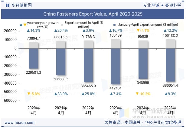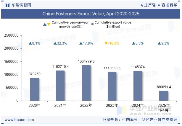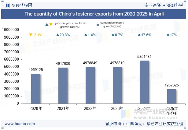 Huajingin teollisuustutkimusinstituutin tiedot osoittavat, että tammikuussa huhtikuussa 2025 Kiinan kiinnittimien vientimäärä oli 1967325 tonnia verrattuna edellisen vuoden samaan ajanjaksoon lisääntyi 283310 tonnia, mikä on 17%: n kasvu; Vientimäärä 380051,4 miljoonaa Yhdysvaltain dollaria verrattuna edellisen vuoden samaan ajanjaksoon kasvoi 31052,4 miljoonaa Yhdysvaltain dollaria, mikä on 9,3%.2025 huhtikuuta Kiinan kiinnitysvienti oli 536 285 tonnia; Vientiarvo on 106 182 000 dollaria.