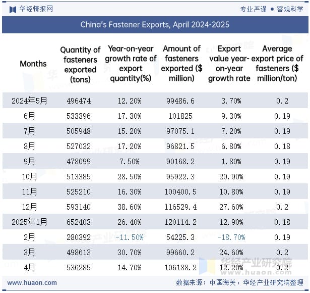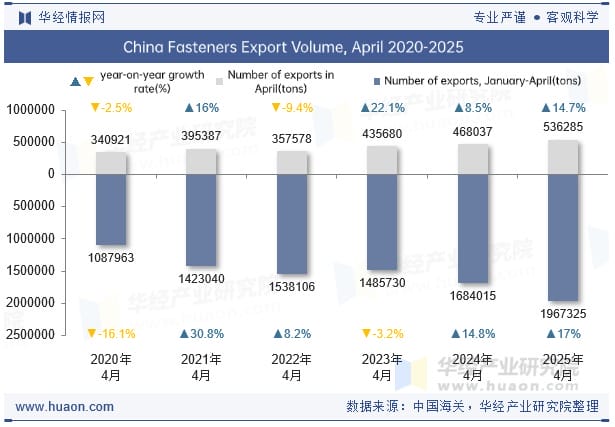 Huhtikuussa 2025 Kiinan kiinnittimien vientimäärä oli 536 285 tonnia verrattuna edellisen vuoden samaan ajanjaksoon, kasvua 68 248 tonnia, kasvua 14,7%; Vientimäärä 106 188 000 Yhdysvaltain dollaria verrattuna edellisen vuoden samaan ajanjaksoon, nousu 111 492 000 Yhdysvaltain dollariin, mikä on 12,2%lisäys; Viennin keskimääräinen hinta oli 0,2 miljoonaa Yhdysvaltain dollaria / tonni.