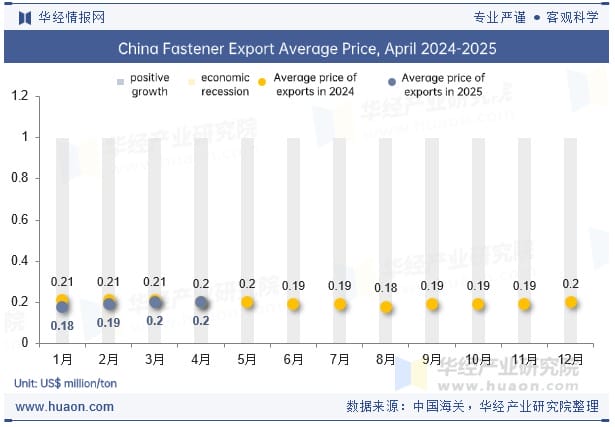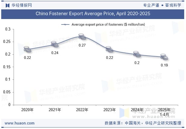 Kiinan kiinnittimien viennin keskimääräinen hinta tammikuu 2025 oli 0,19 miljoonaa dollaria/tonni, tammikuun 2024 tammikuun 2024 viennin keskimääräinen hinta oli 0,21 miljoonaa dollaria.